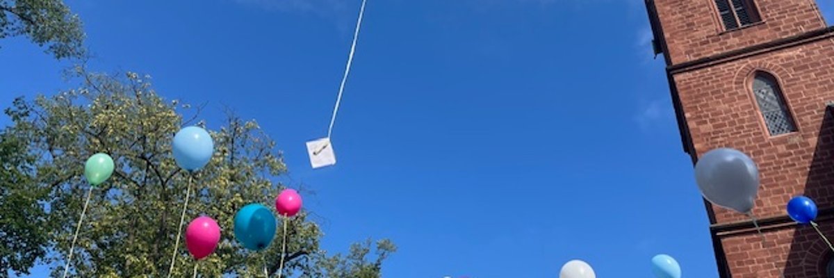 Nach dem Gottesdienst und vielen schönen und auch ergreifenden Liedern und Gottesdienstelementen, bei denen sogar Masken zum Einsatz kamen, durften die Kinder der 4. Schuljahre - gemeinsam mit ihrer Klassenlehrkraft Frau Wilms - Luftballons in die Höhe steigen lassen.