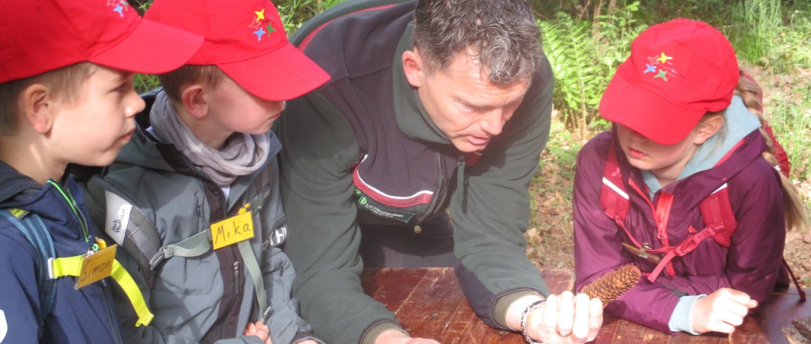 Ein besonderer Schwerpunkt lag auf dem Erkennen von Bäumen und Waldtieren. Während des Weges hielten die Kinder immer wieder an, um Blätter, Früchte oder Rinden genauer zu betrachten und zu bestimmen. Auch das Wissen über heimische Tiere wurde spielerisch getestet, was den Schülerinnen und Schülern großen Spaß bereitete.