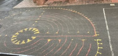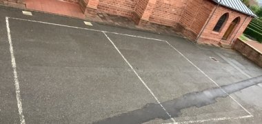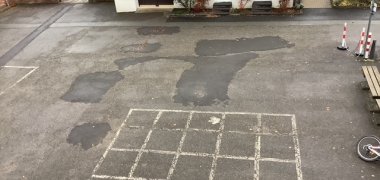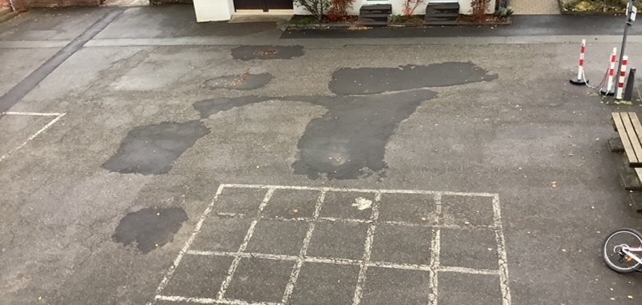 Man kann hier schön unseren alten Schulhof sehen. Dieser ist fast komplett geteert, zum Teil kaputt. Es gibt Löcher, die Stolperfallen sind und die aufgemalten Spielfelder sind auch verblasst.